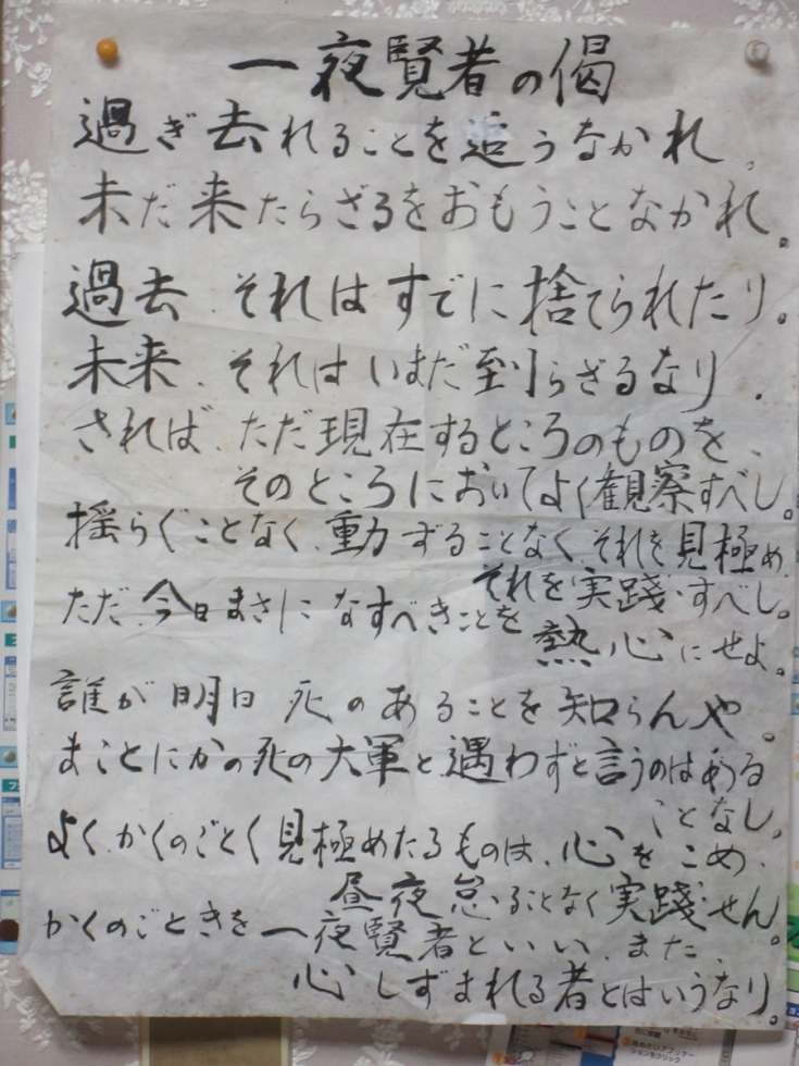 ただ今日まさに作すべきことを熱心になせ。 たれか明日死のあることを知らんや。